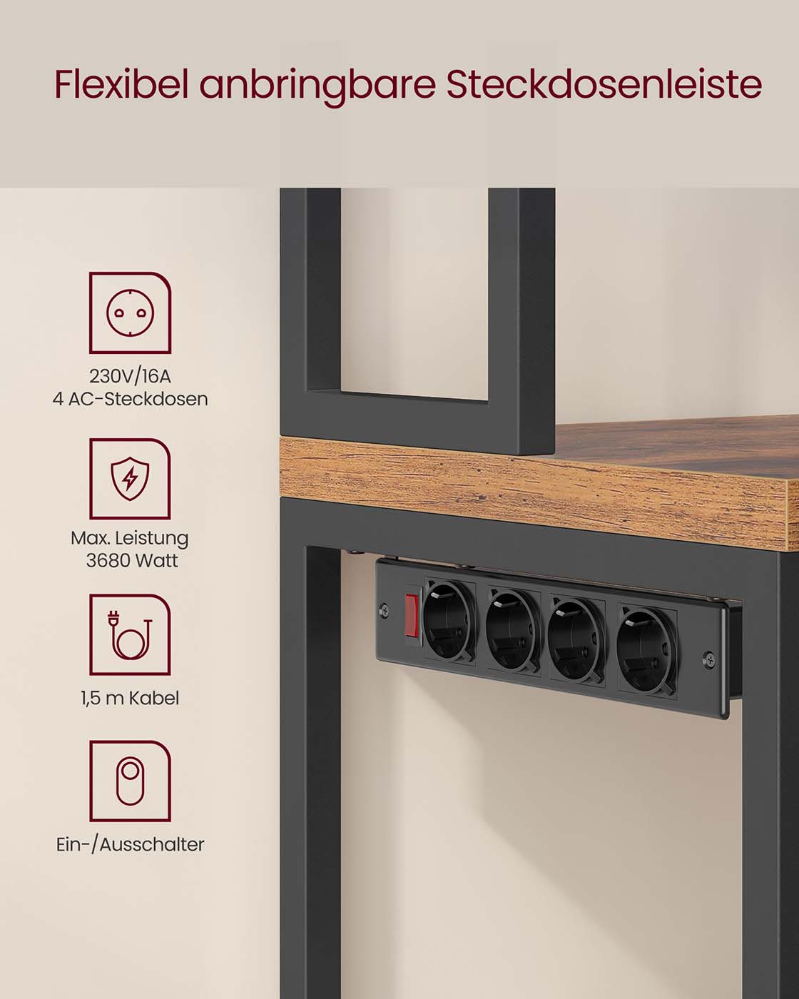 Keukenplank met stopcontacten en haken voor praktische opbergruimte 90 cm