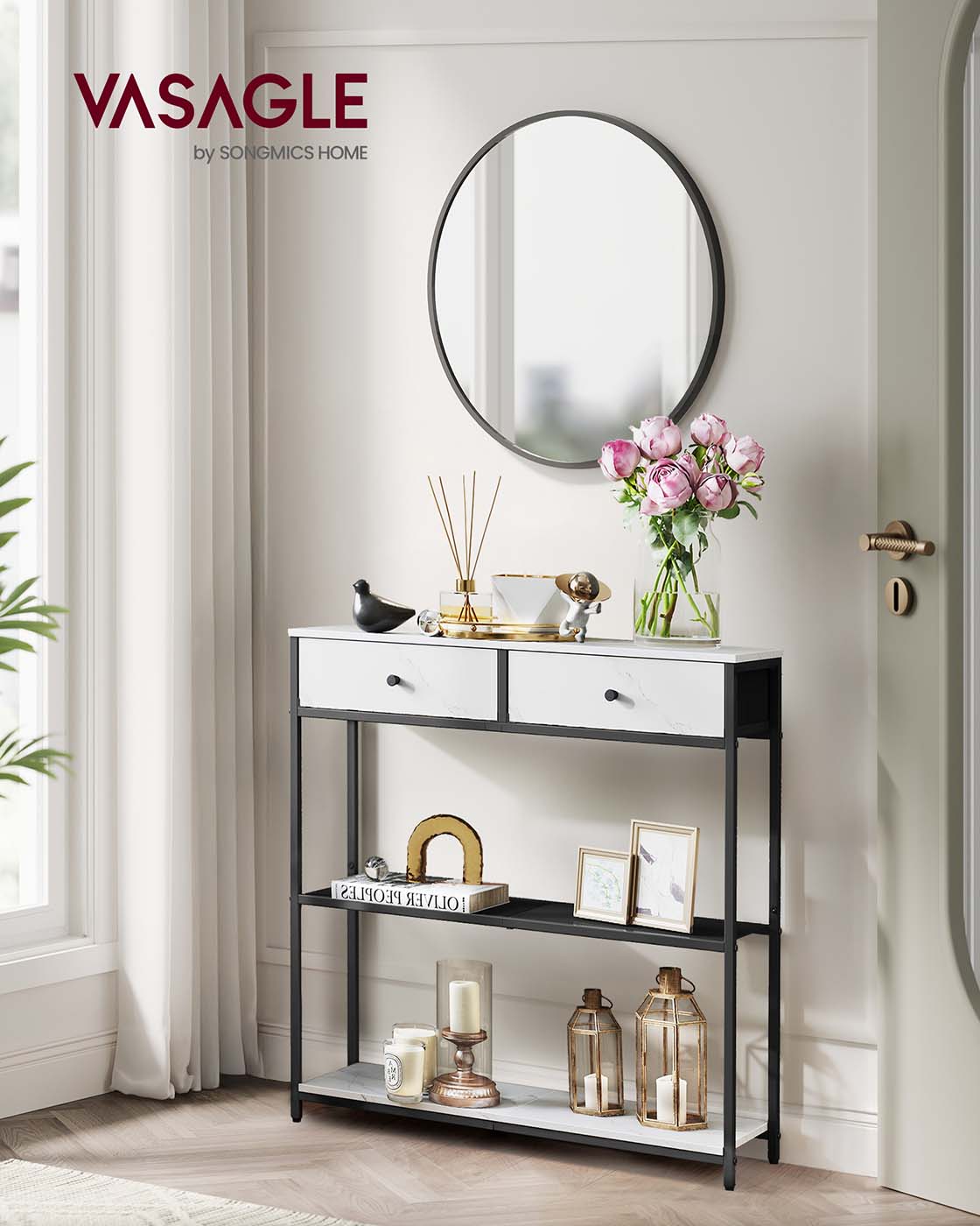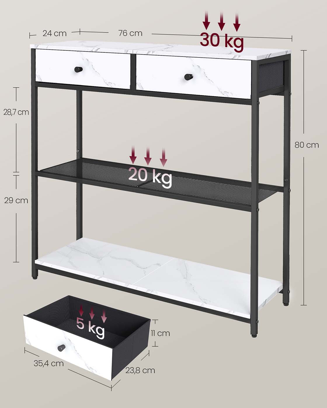 Smalle consoletafel met twee stoffen lades 24 x 76 x 80 cm - LNT092W01