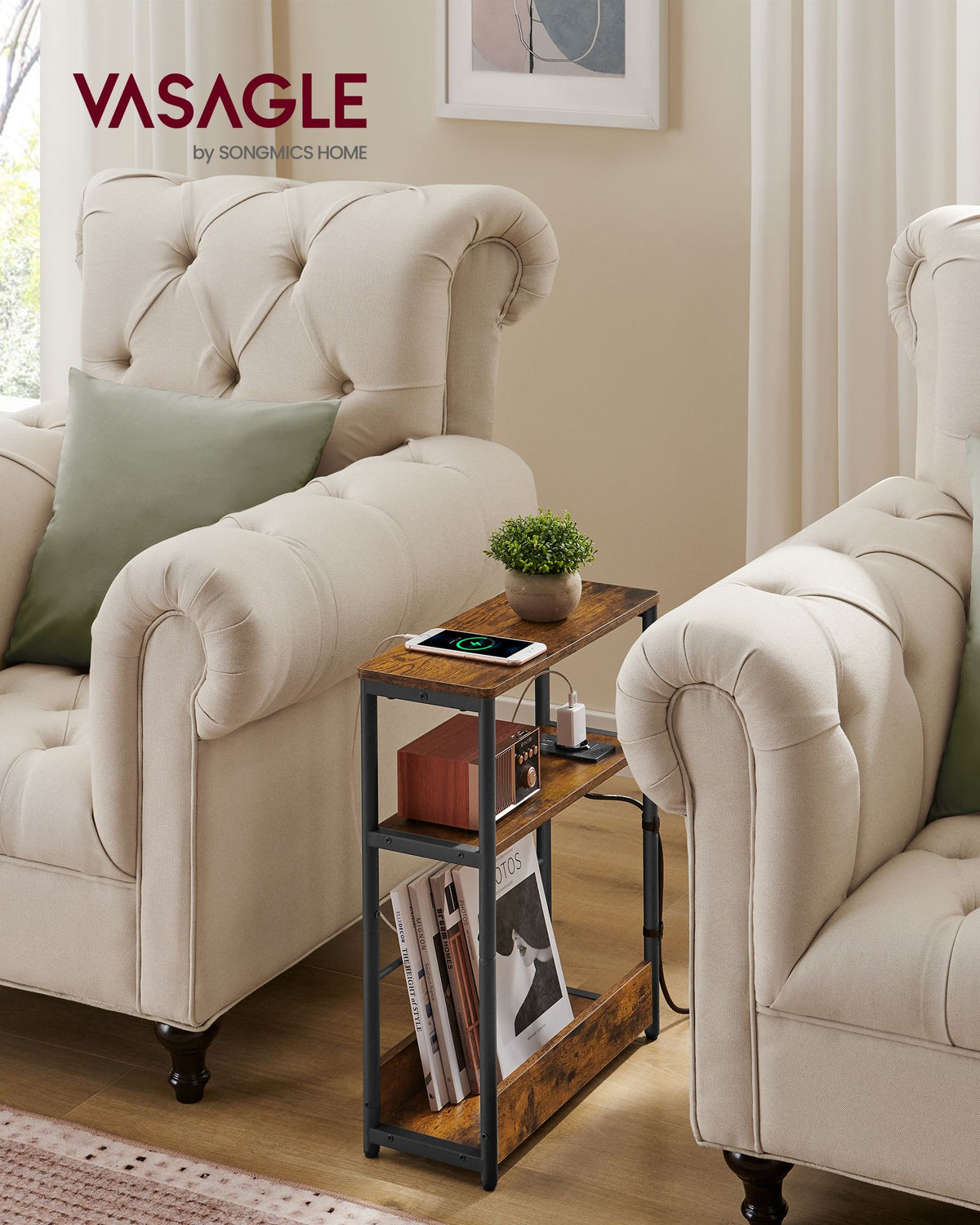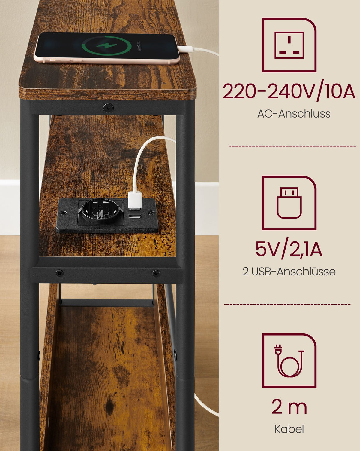 Bijzettafel met 3 planken, smal, vintage bruin-inktzwart 18 x 45 x 58 cm