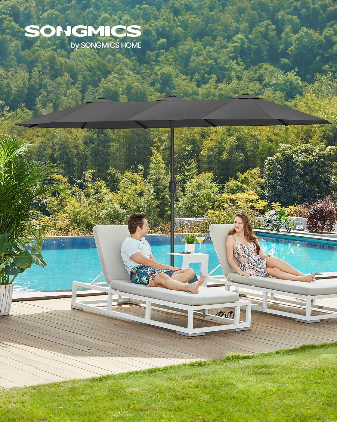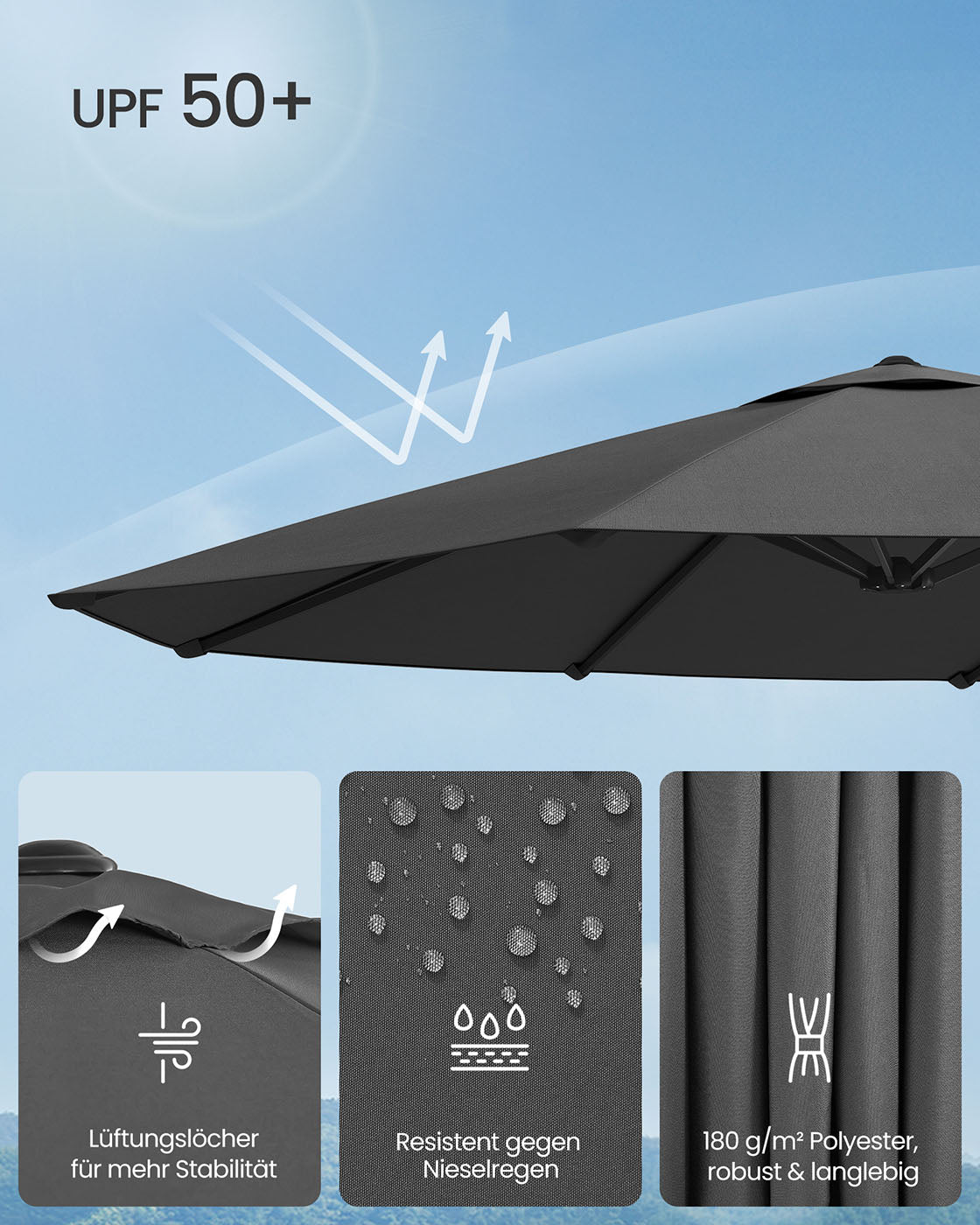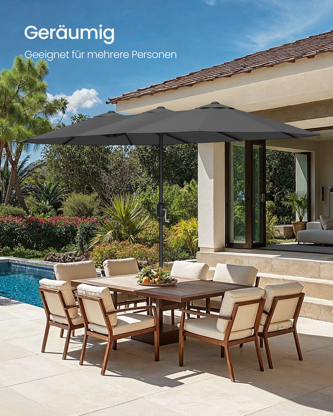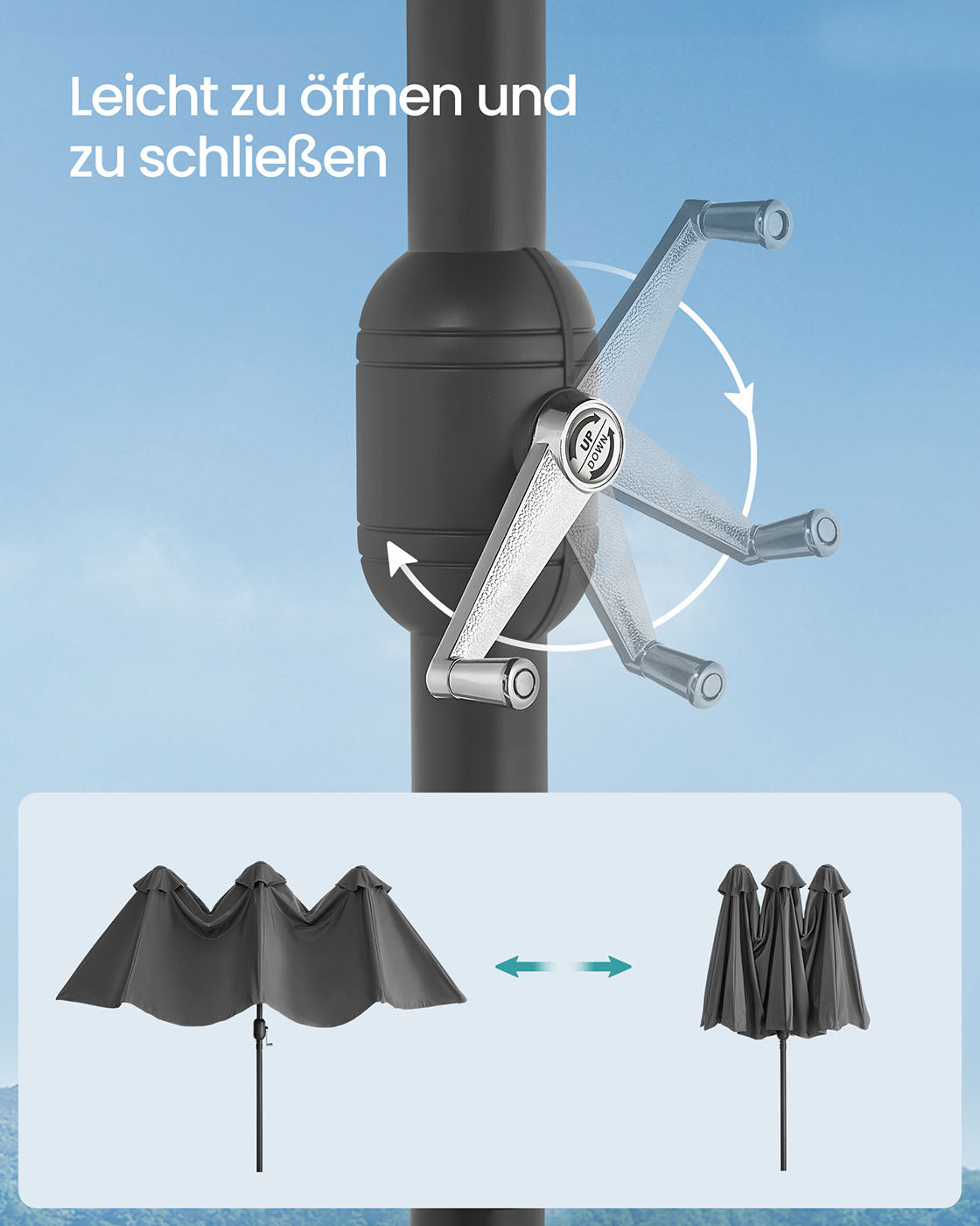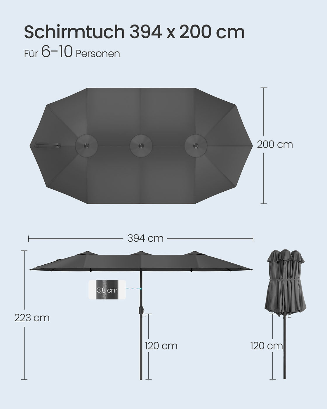 Dubbele parasol 394 x 200 cm UPF 50+ zonder voet leigrijs