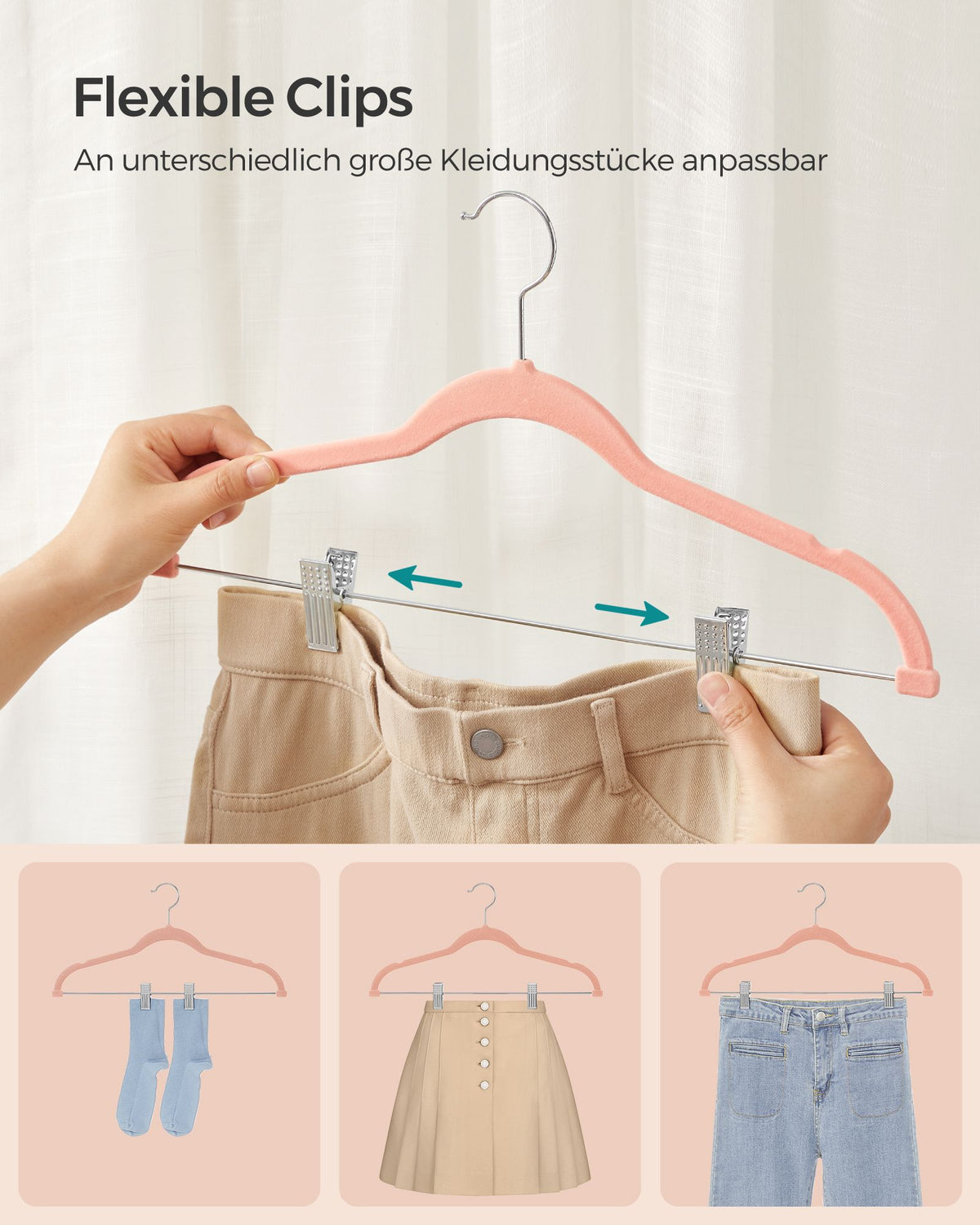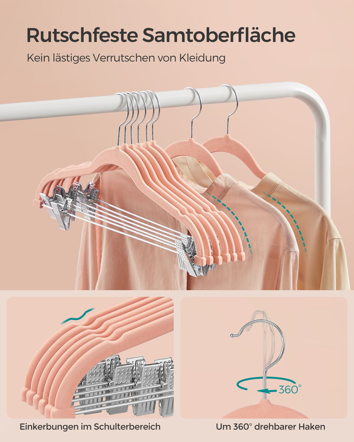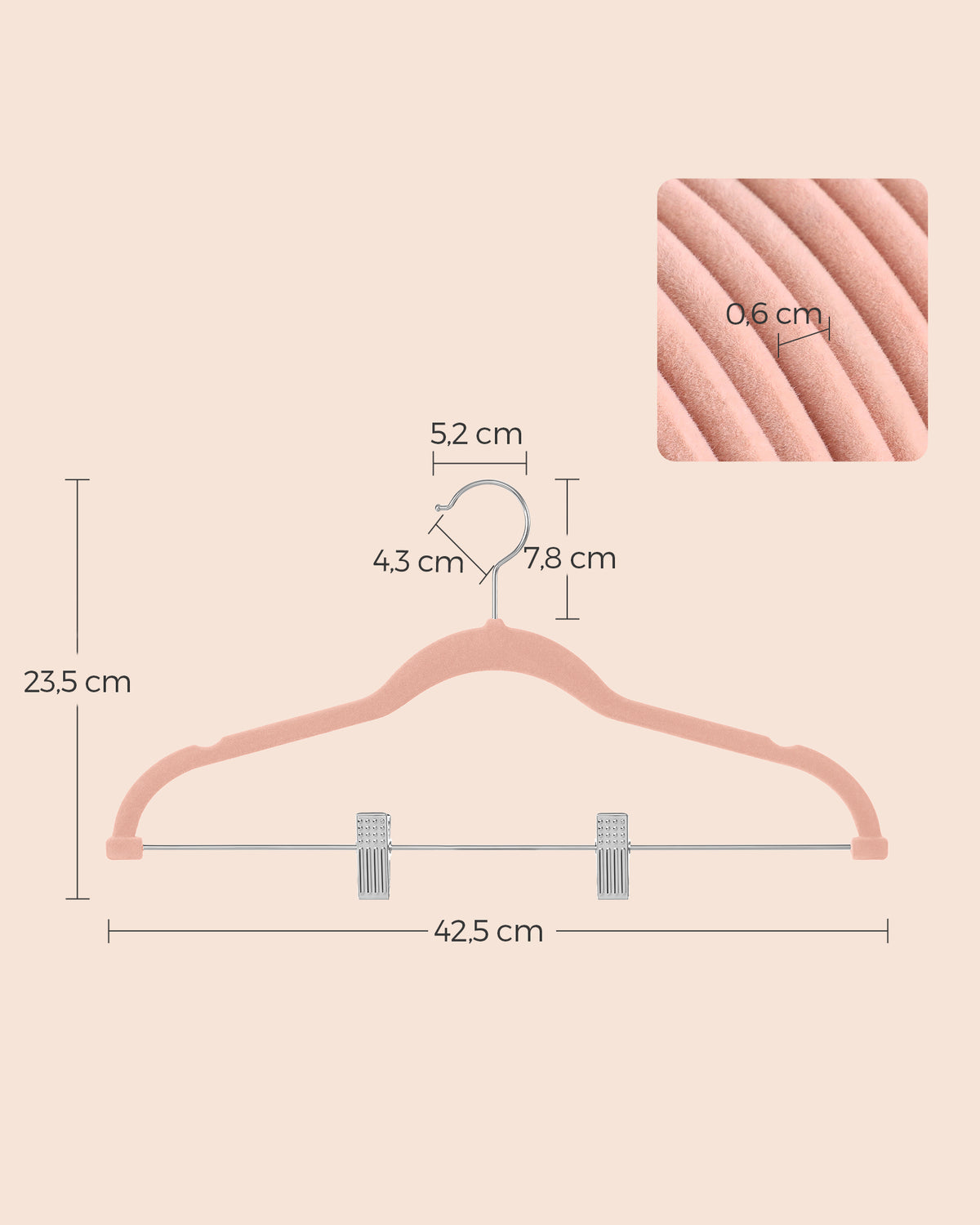 Fluwelen kledinghangers, set van 10, antislip, ruimtebesparend, lichtroze 5 cm