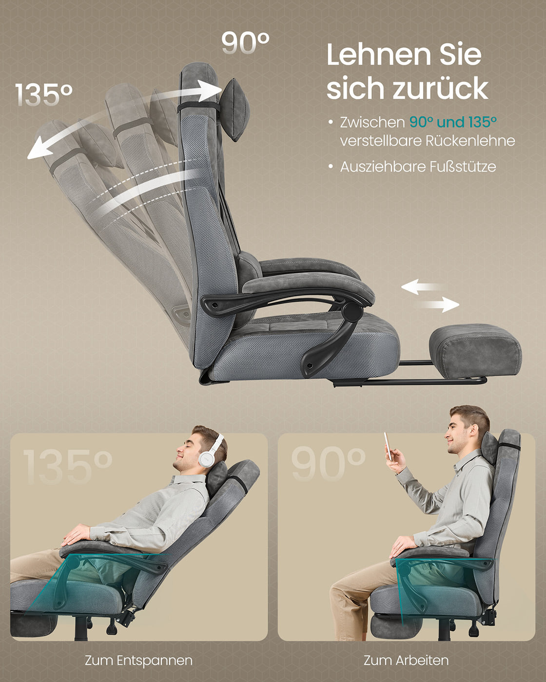 Gaming stoel met voetenbank en verstelbare hoofdsteun, leigrijs
