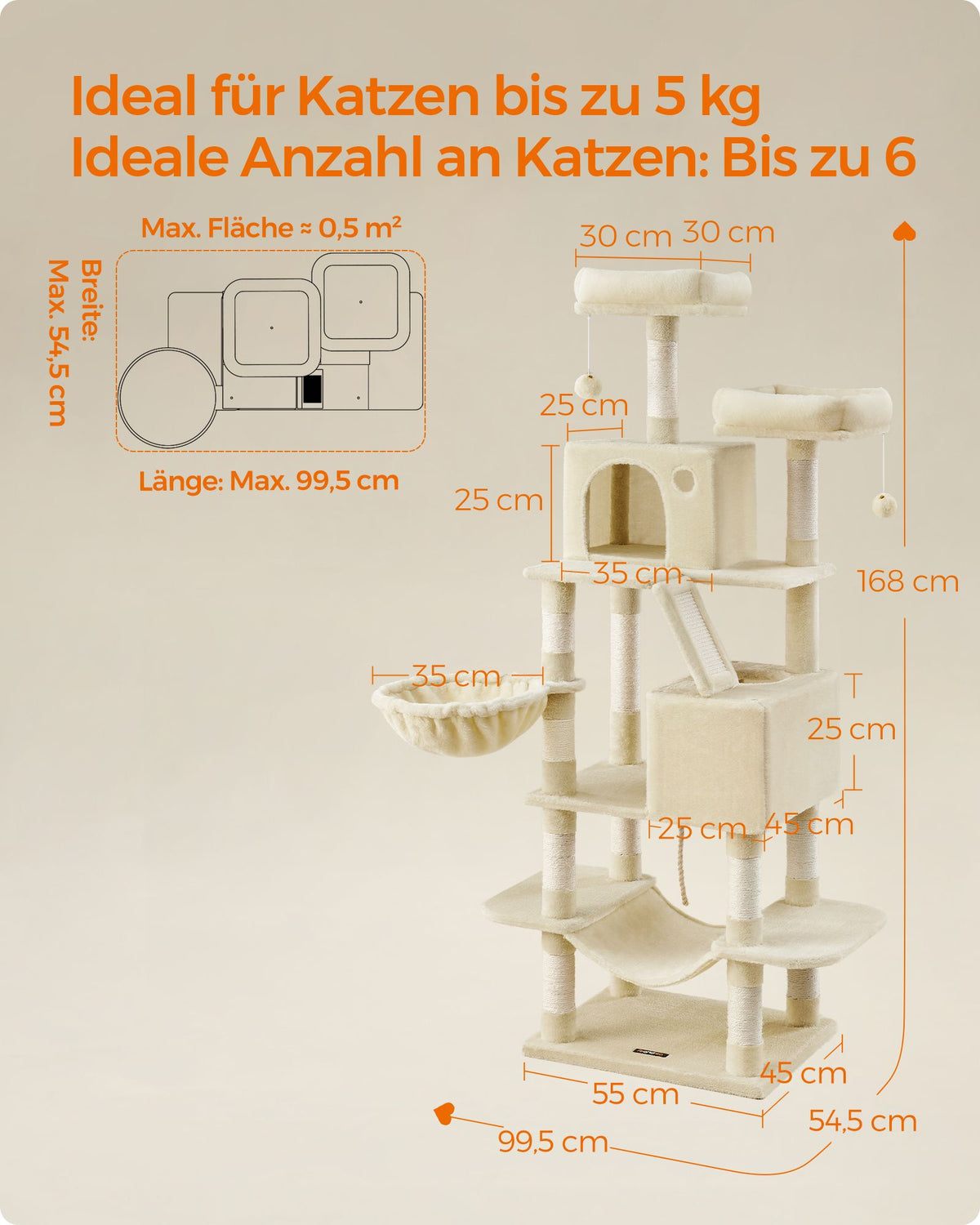 Grote kattenboom met 2 platforms en pluchen ballen, beige 168 cm