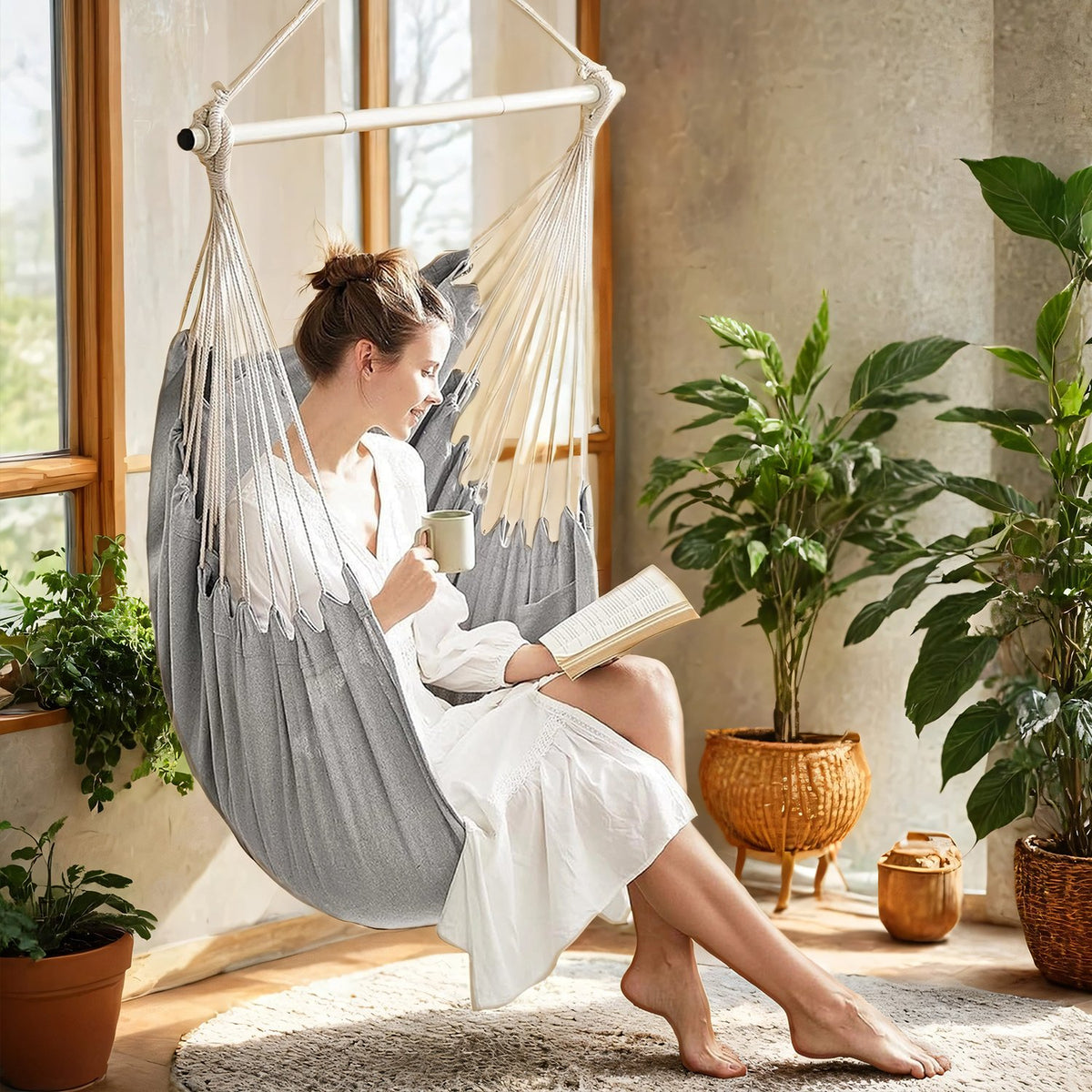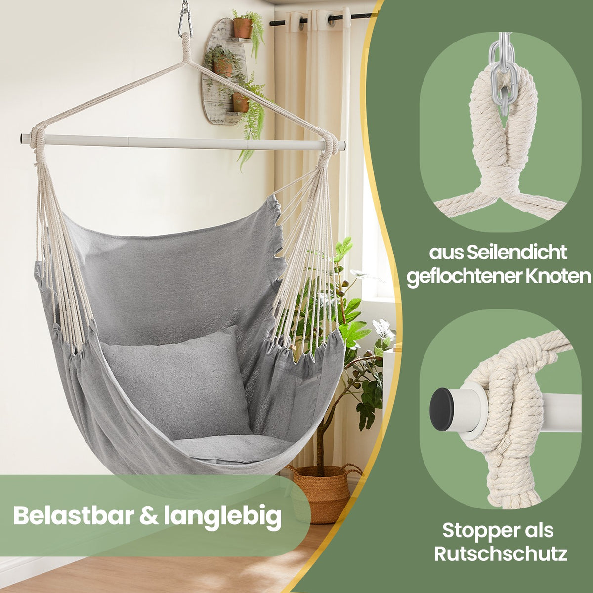 Hangstoel, hangschommel met 2 kussens, hangstoel, metalen ketting 140 cm