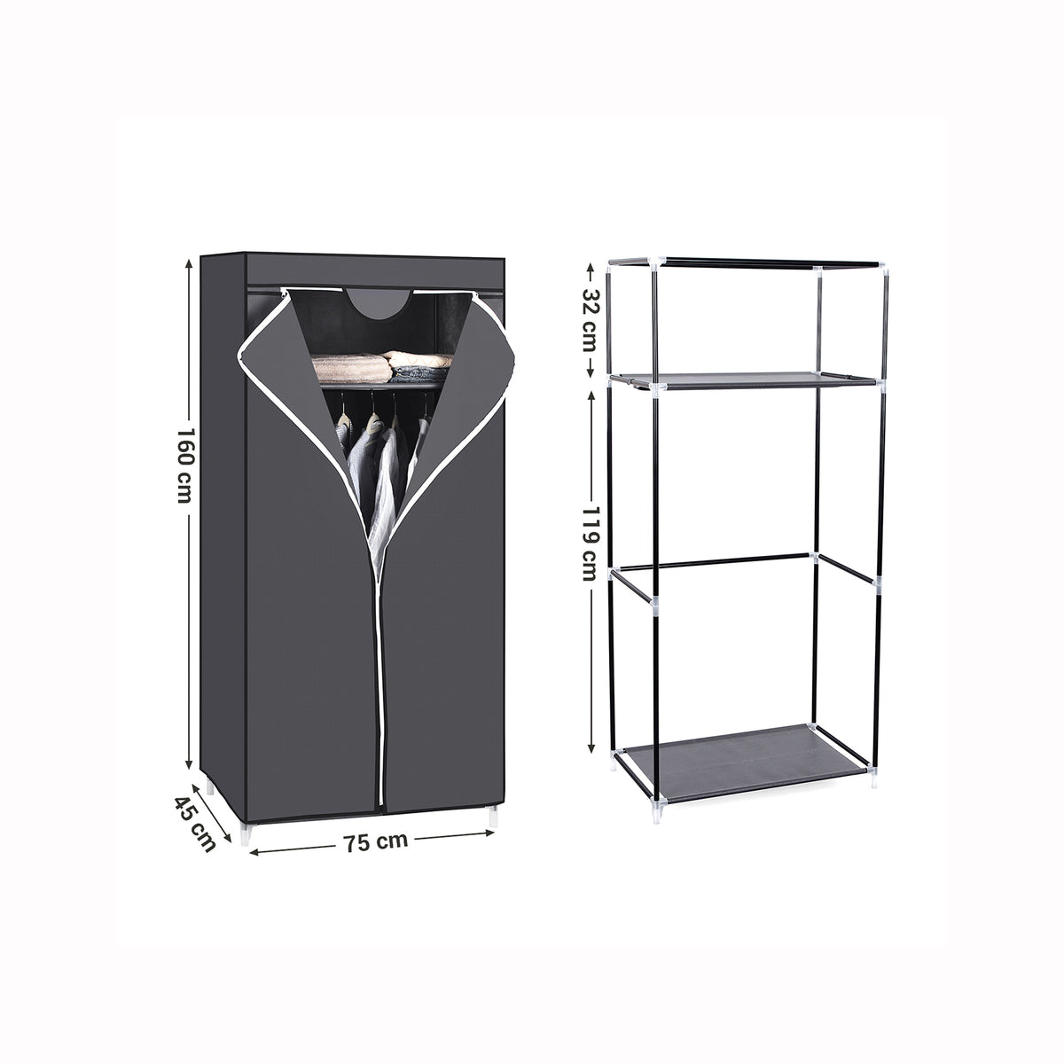 Opvouwbare kledingkast met kledingstang 160 x 75 x 45cm