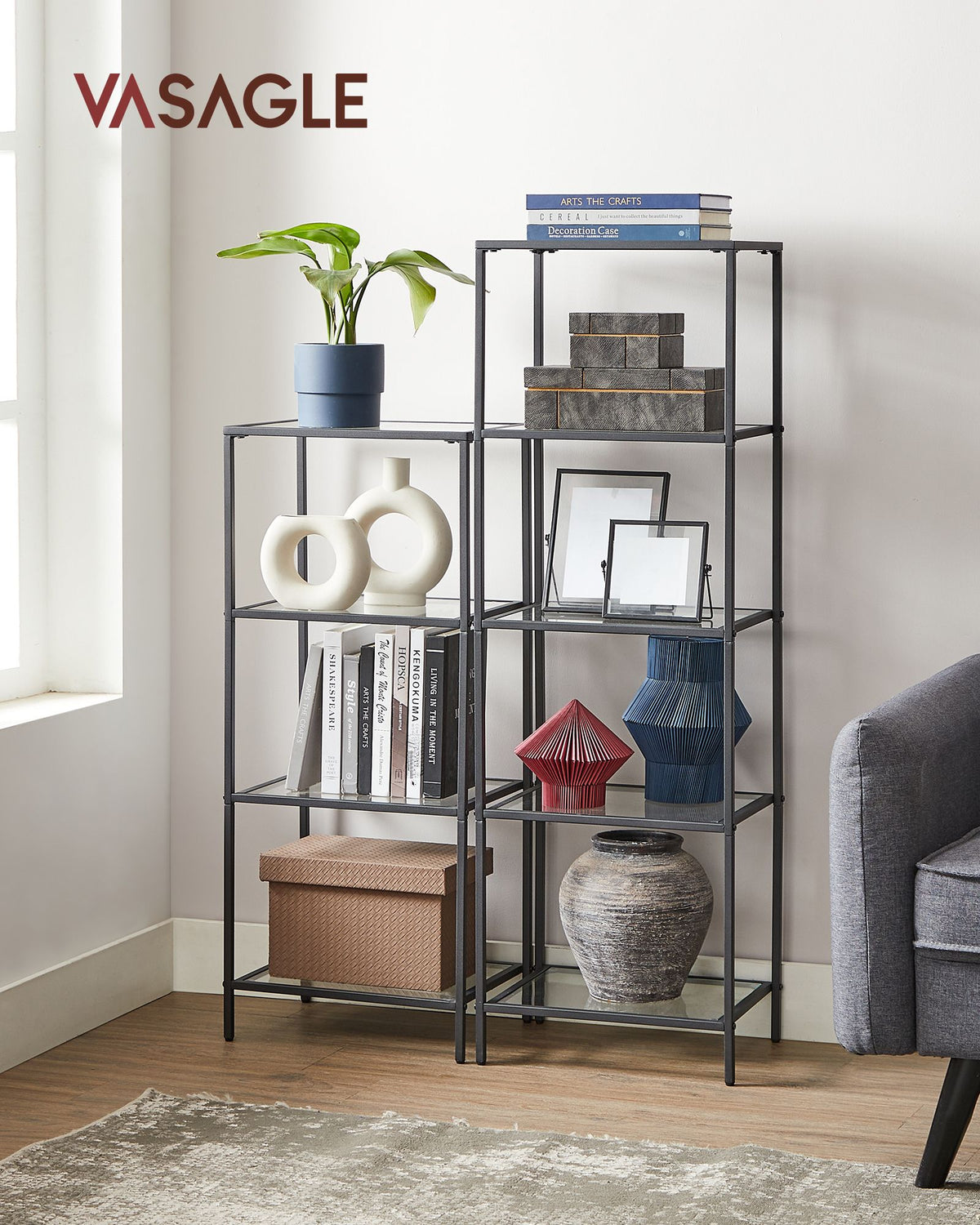 Plank met 5 planken, eenvoudige montage, transparant-inkt zwart 5 cm