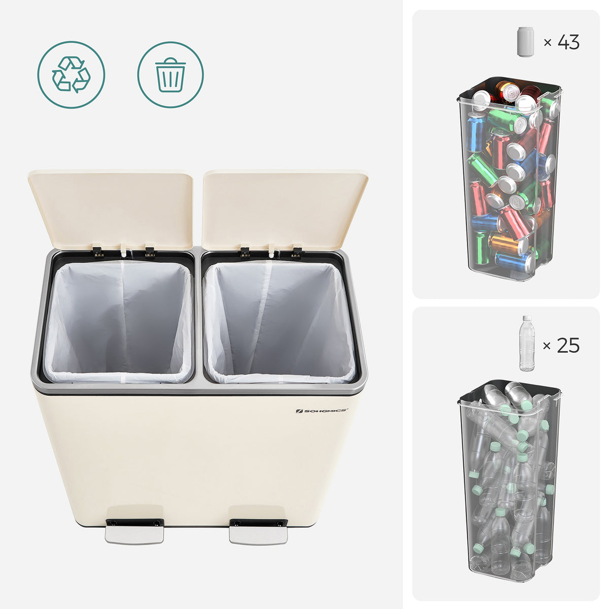 Prullenbak 2 x 30 liter met deksel en binnenemmer crèmewit 2 cm