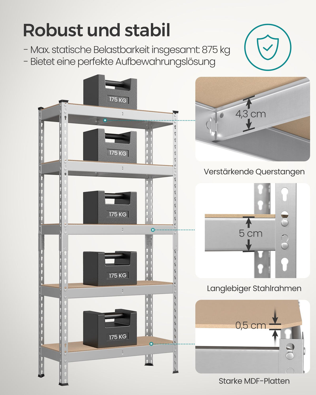 Robuuste stellingkast met 5 planken, 45 x 90 x 180 cm, zilver