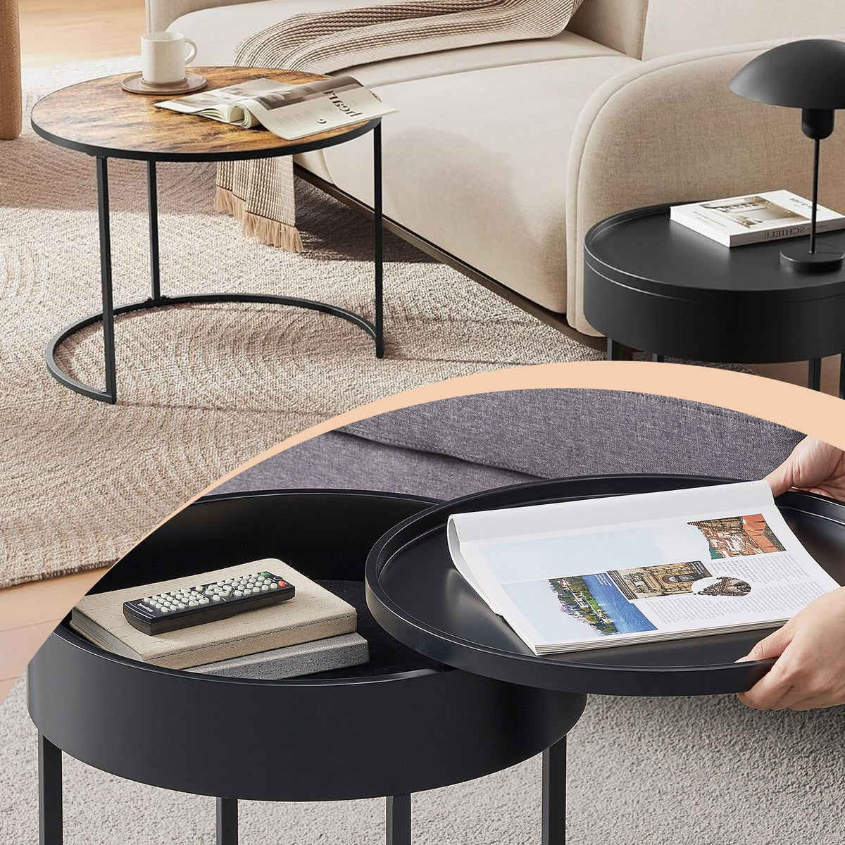 Ronde salontafelset van 2, vintage bruin-inktzwart 60 x 60 x 45 cm - LCTB35044K01