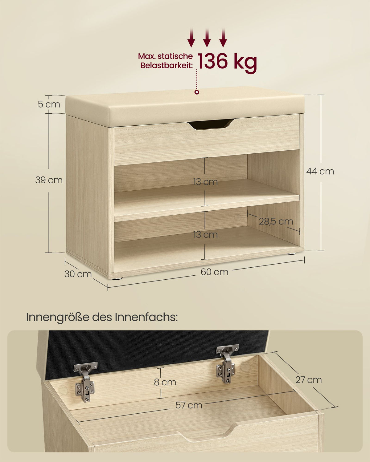 Schoenenbank met kussen 30 x 60 x 44 cm naturel beige