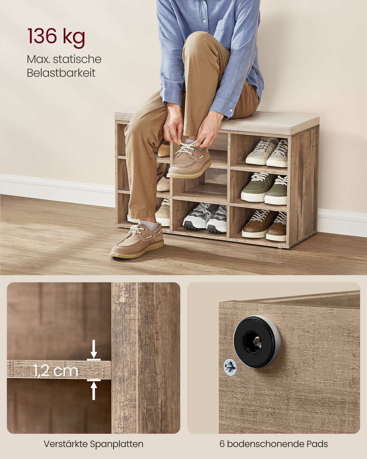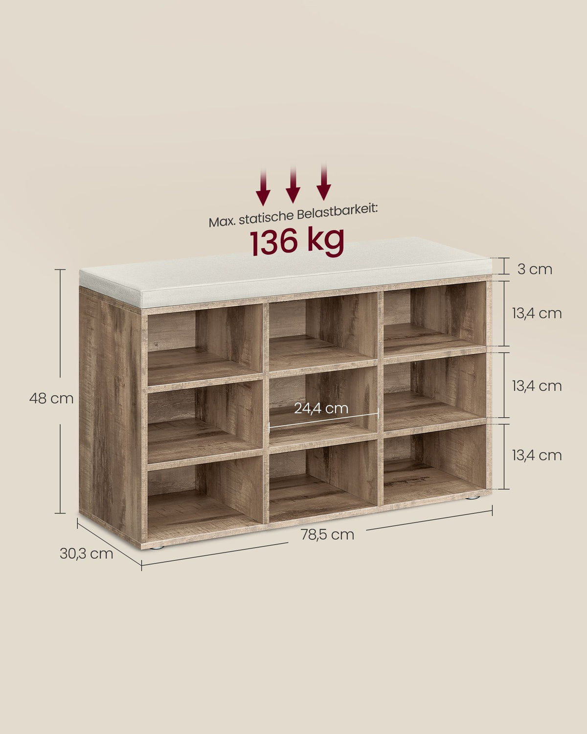 Schoenenrek met zitting 30,3 x 78,5 x 48 cm camelbruin
