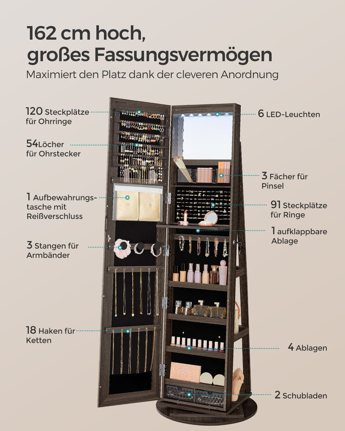 Sieradenkast met grote spiegel en 3 planken