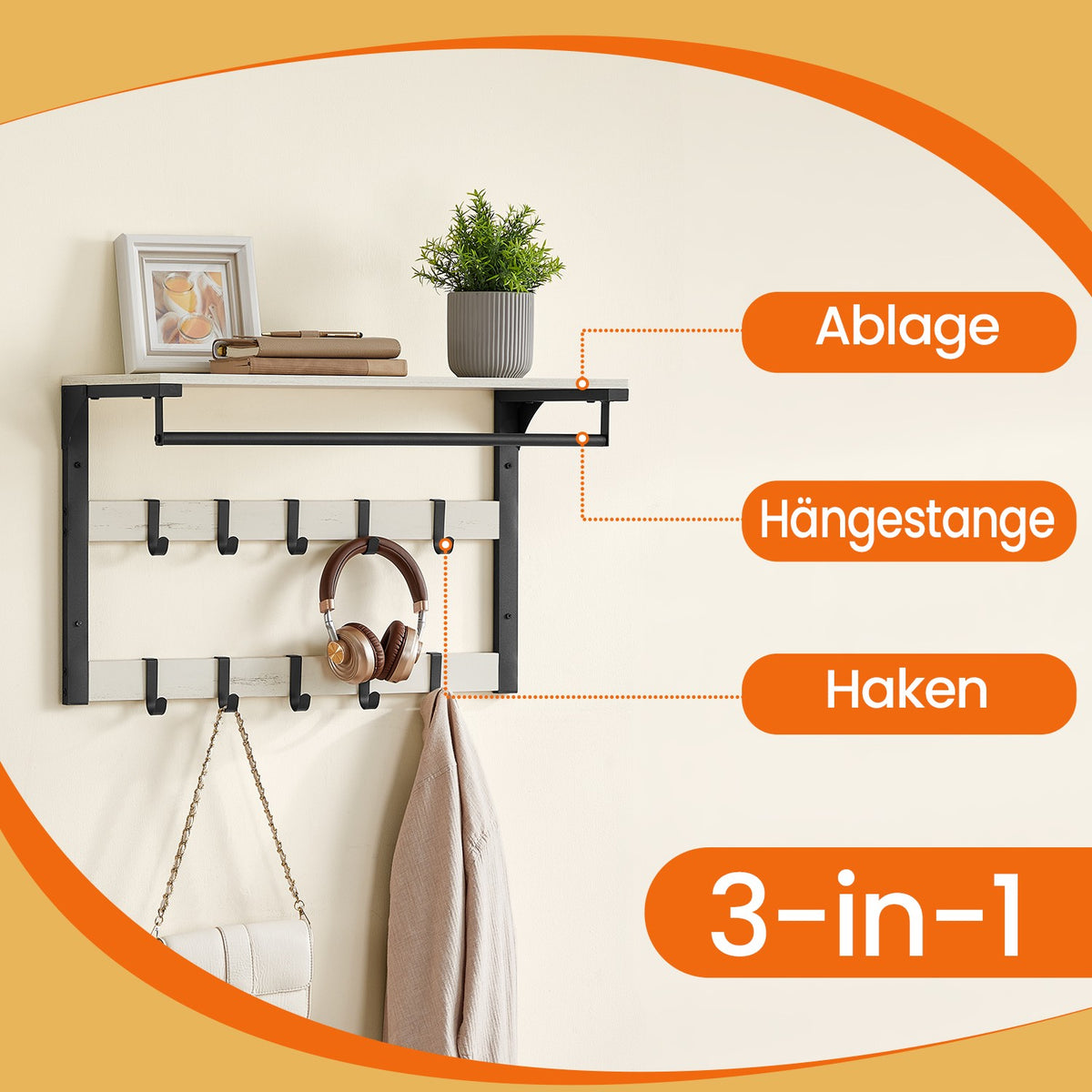 Wandkapstok, met plank, wandplank met 10 afneembare haken 30 x 65 x 42 cm - LCRB35101W03