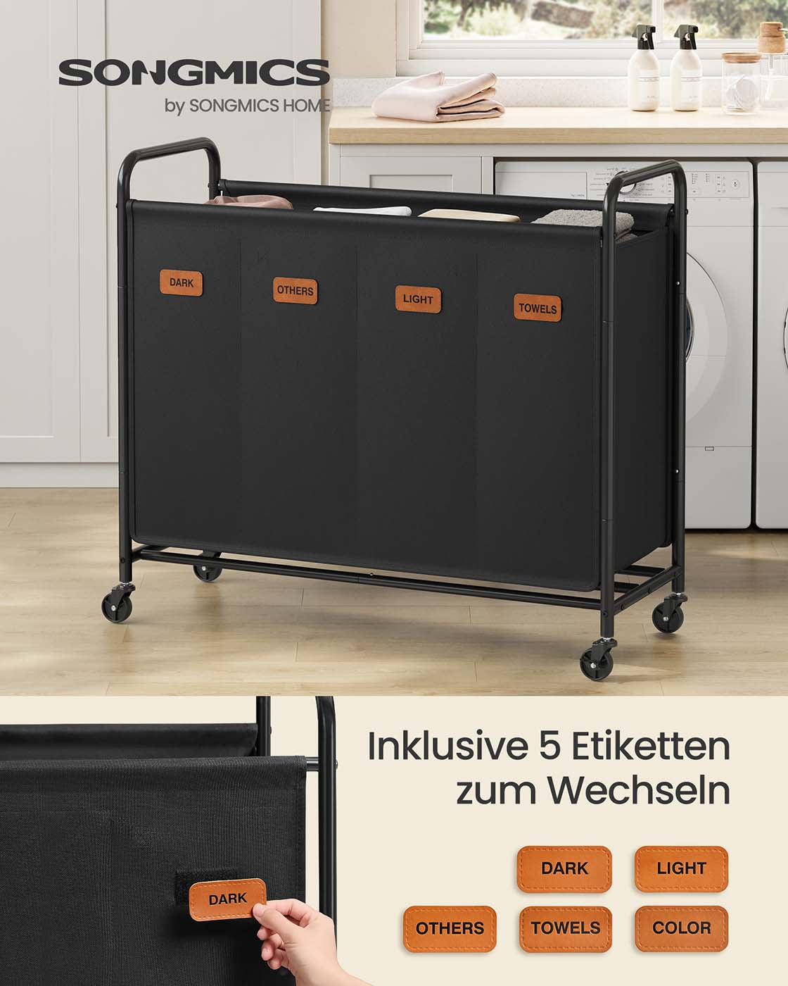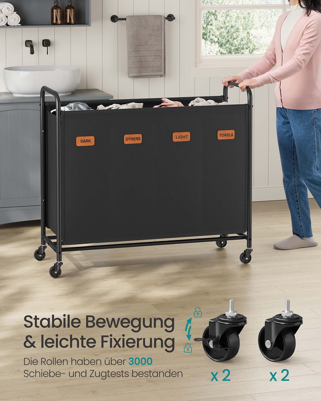 Wasmand 200 L met wielen en 3 compartimenten inktzwart 79 x 40 x 91 cm